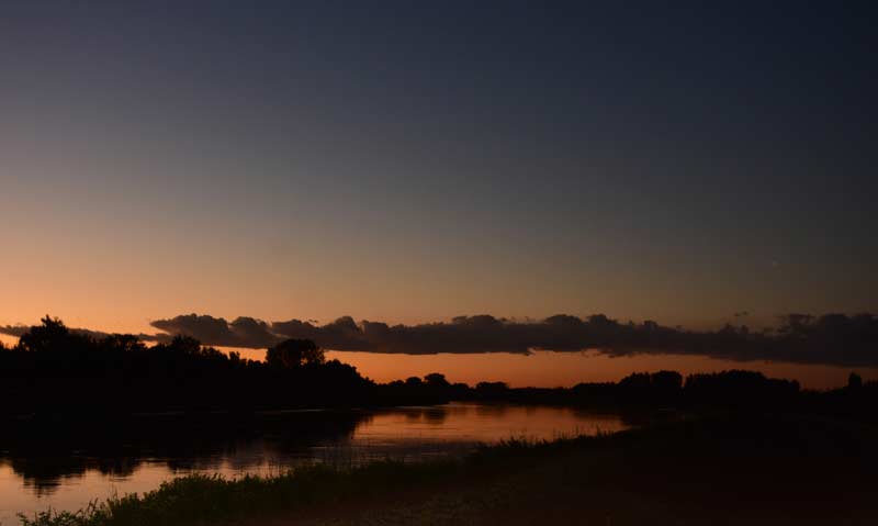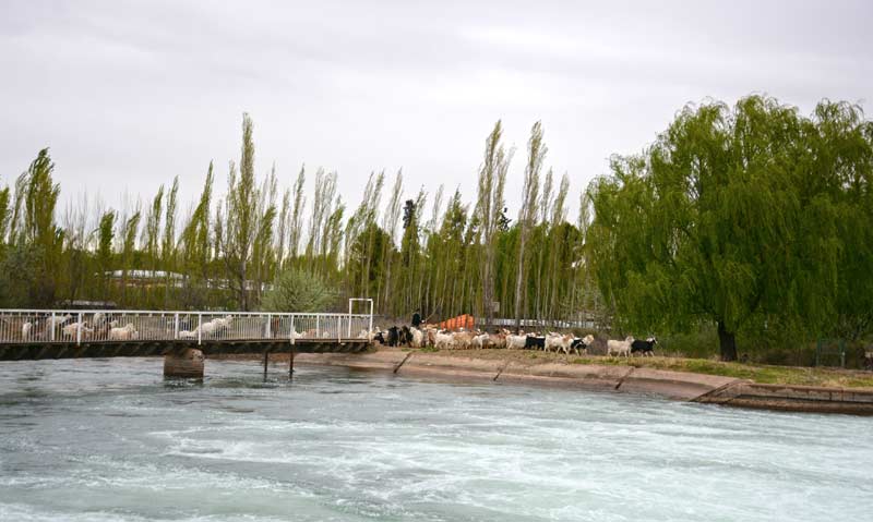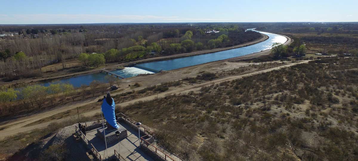 Difícil encontrar uno más lindo que este atardecer en el Canal, que aquí es bien ancho, de unos 50 metros, con las nubes que se reflejan en el agua y el sol que empieza a apagarse mientras ahora es Marta la que camina en la orilla con las chivas, como hace cada vez que su marido se va en la bici roja rumbo a su trabajo en una cooperativa frutícola y ella se queda al comando, acompañada por los perros y visitada por los hijos. En lo alto, brilla María Auxiliadora. Una pareja se saca una selfie con el fondo del agua y cinco ciclistas esperan su turno antes de volver a los senderos de las bardas, en la margen norte, el lado árido.